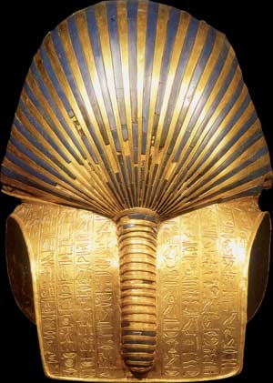 Una pieza, la mascara funeraria, que representa el rostro idealizado de Tutankamón, ‘imagen viva de Amón’, recubierta en oro, y que contiene otros materiales como obsidiana, lapislázuli, cuarzo, turquesa, cornalina y vidrio.